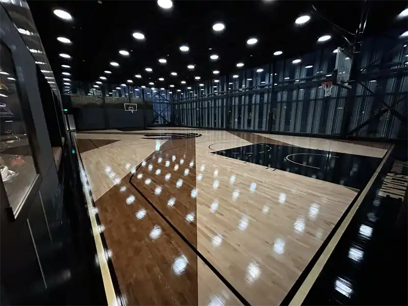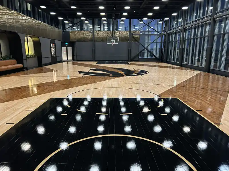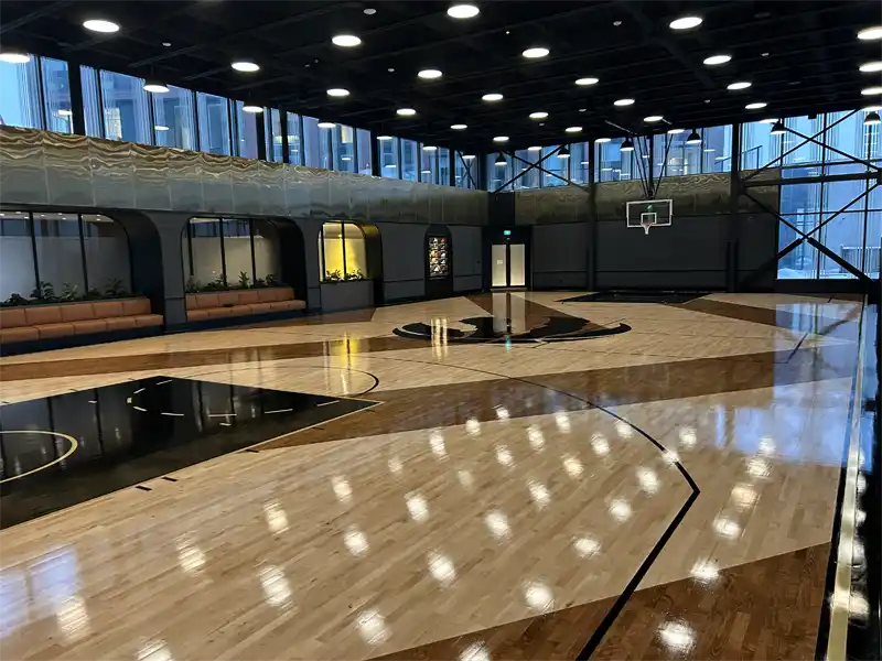 A comprehensive overview of the facility. This project by TSS blends professional sports performance with high-end interior design, featuring spectator seating and modern architectural elements that complement the geometric wood flooring.