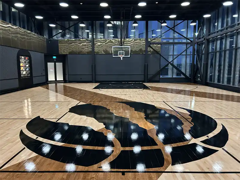 This Raptors-branded court at Fitzrovia’s Elm-Ledbury building in downtown Toronto features 1,700 sq ft of Junckers Uno-Bat 45 hardwood with a custom stain, logo, and 4